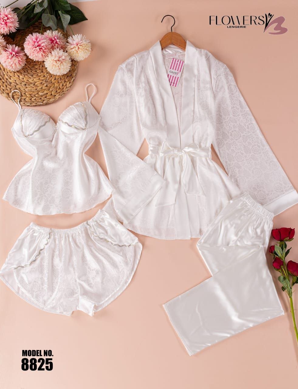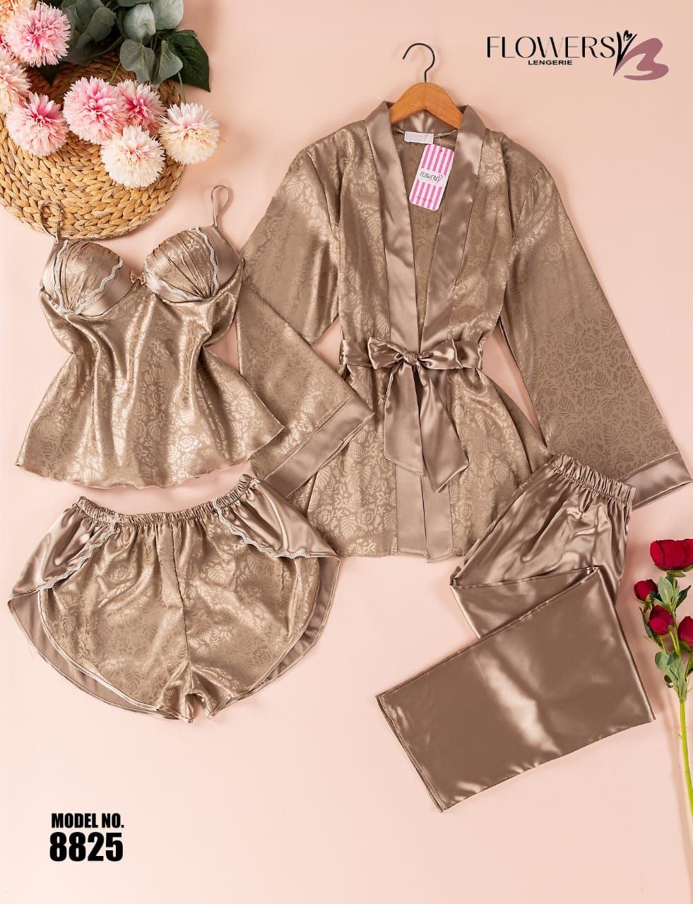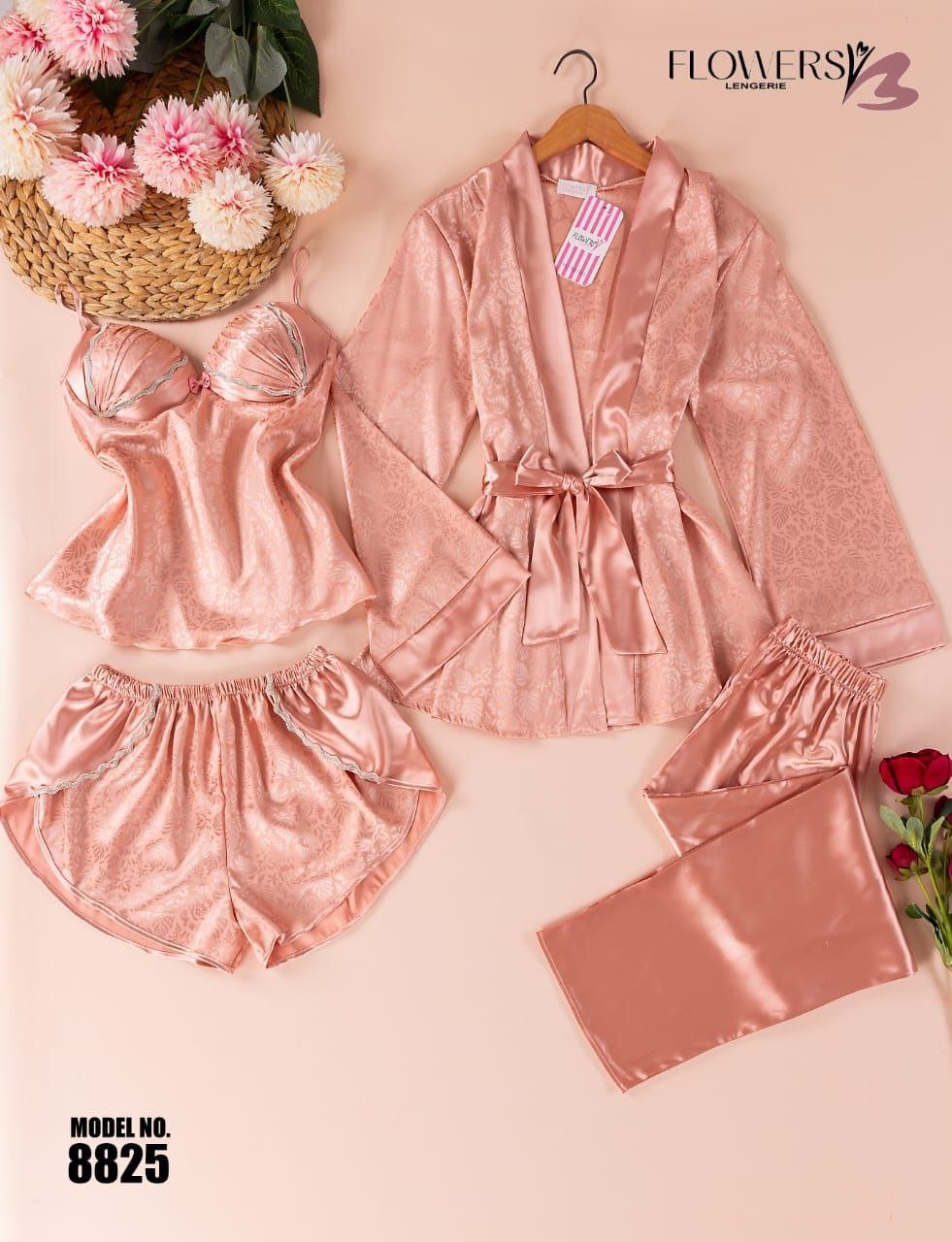 بيجامة ستان 4 قطع من الزهور – الكود 8825