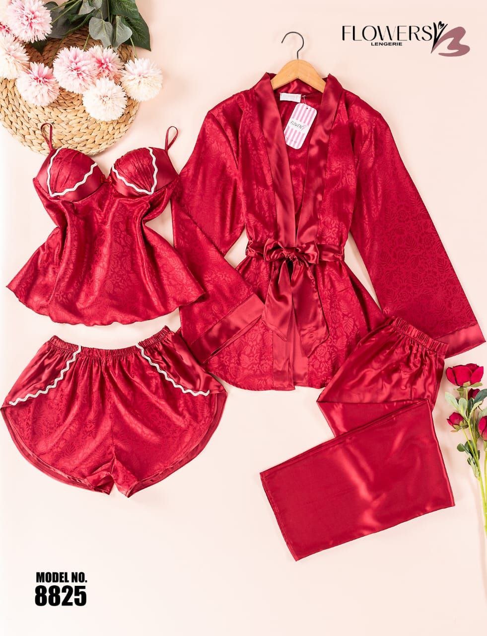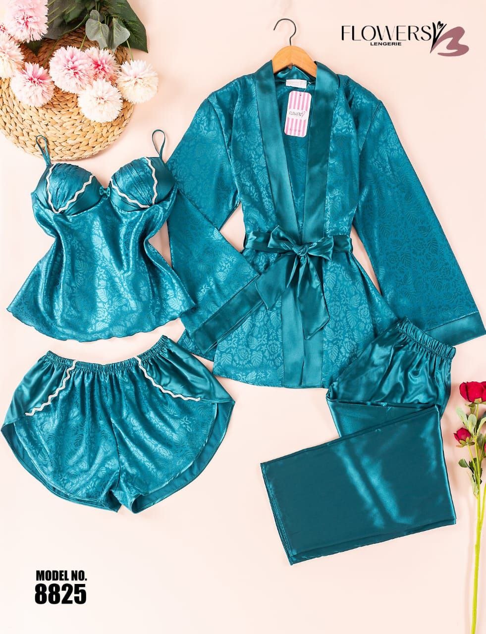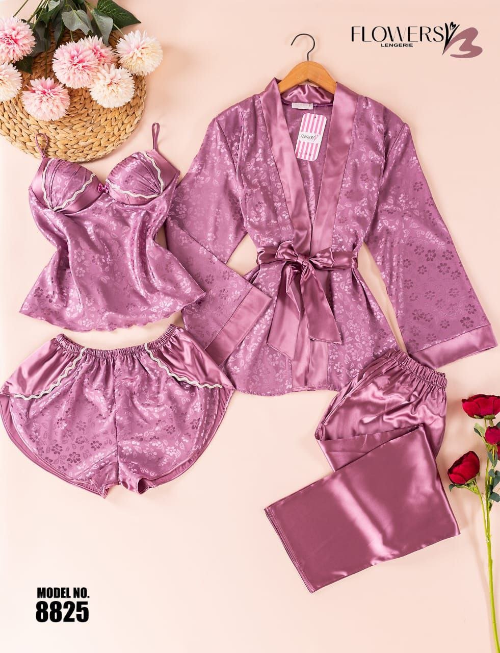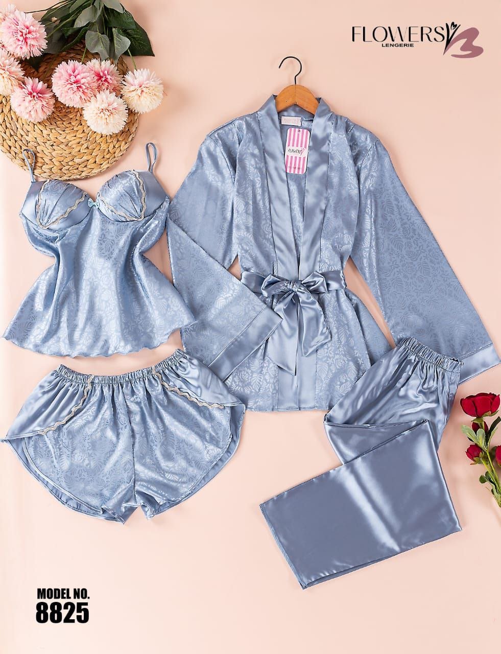 بيجامة ستان 4 قطع من الزهور – الكود 8825