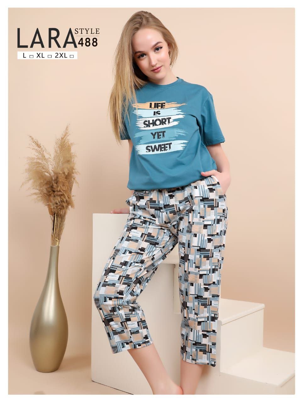 – الطقم الثاني (بالصور الثانية) اللون: أزرق هادئ، مع تصميم مريح، مثالي للاسترخاء أو النوم. الموديل: قميص فضفاض مع عبارة أنيقة “Life is Short Yet Sweet”، مع بنطلون مطبوع بألوان متعددة ومظهر عصري.