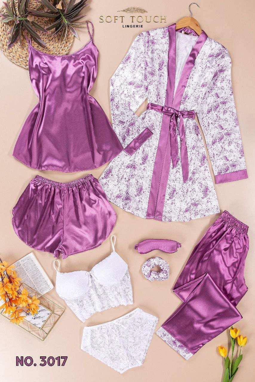 ✨ فخامة متكاملة: بيجامة ستان 6 قطع (كود 3017) ✨