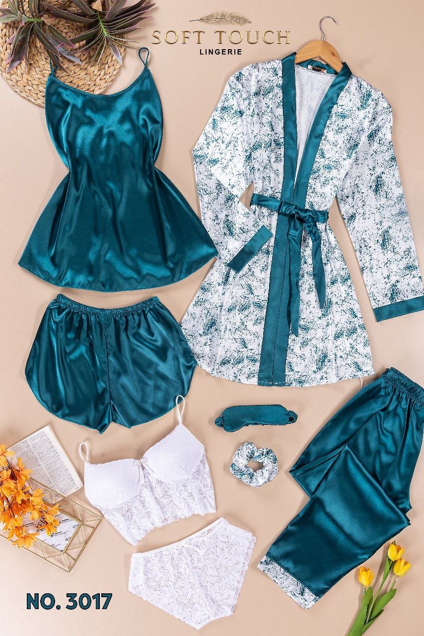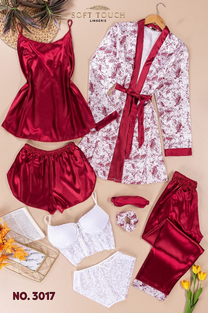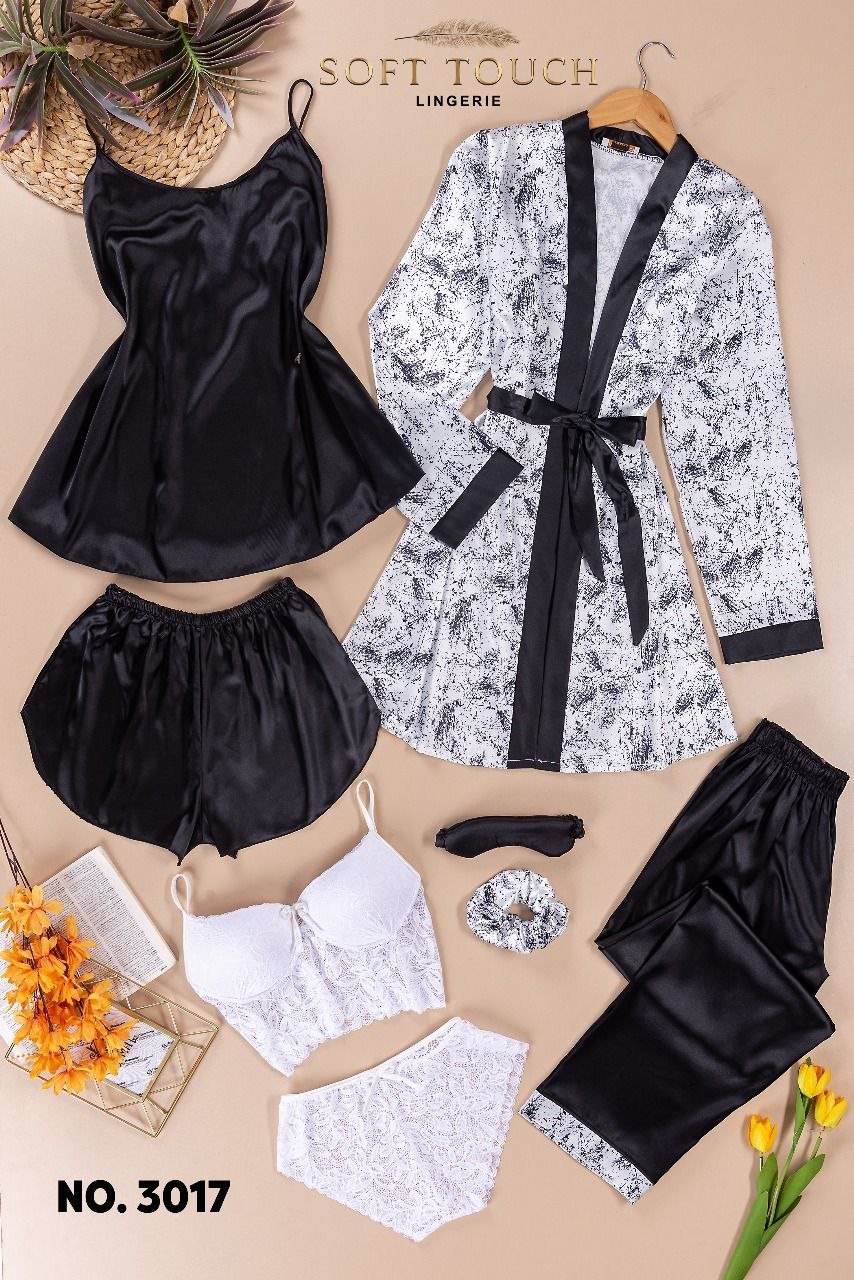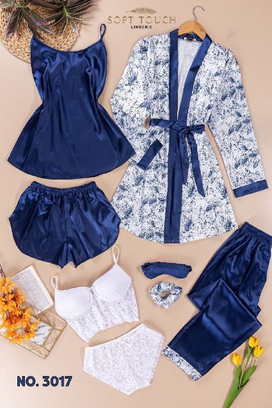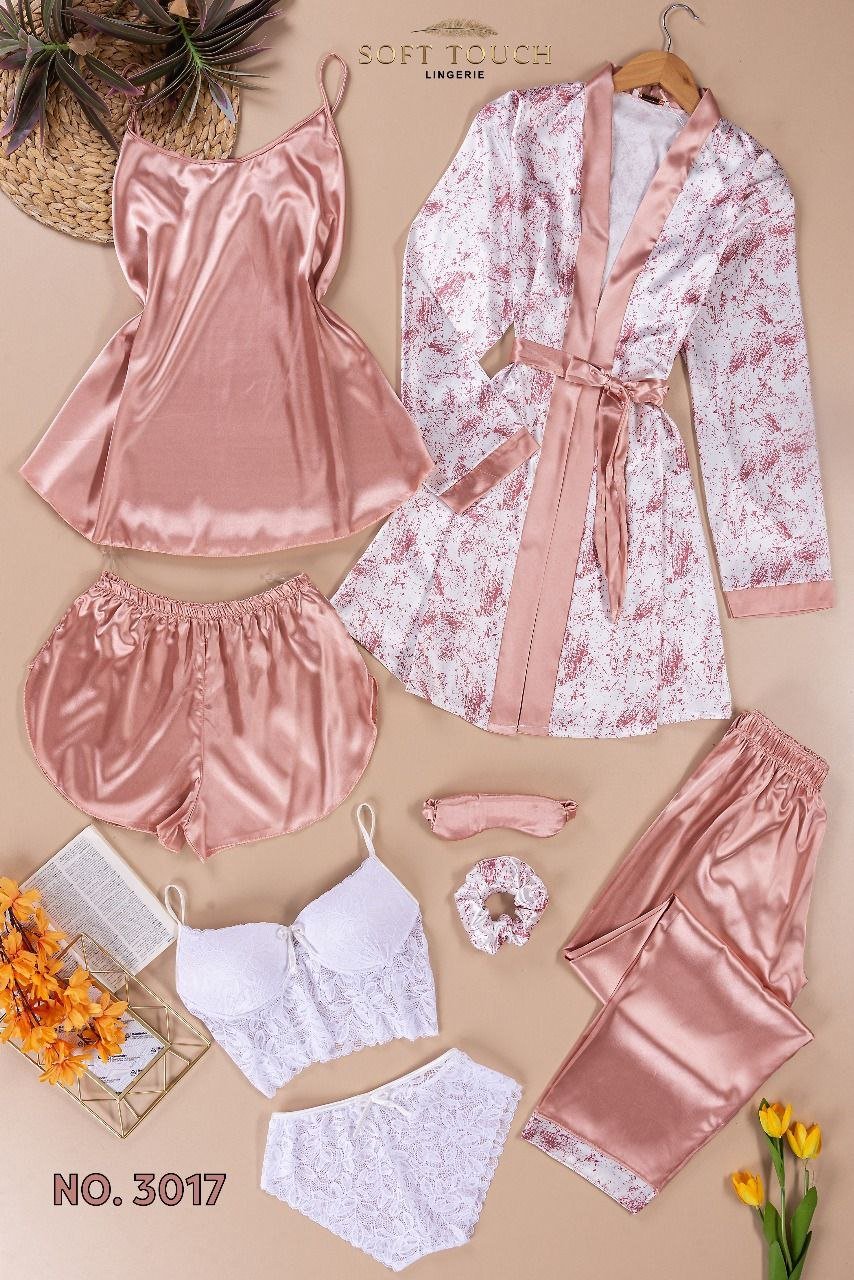 طقم لانجيري نسائي فاخر ومكتمل، مكون من ست قطع مصمم ليمنحكِ إطلالات متعددة ومريحة في جميع الأوقات. يجمع الطقم بين الستان الناعم وتفاصيل الدانتيل والروب الأنيق.