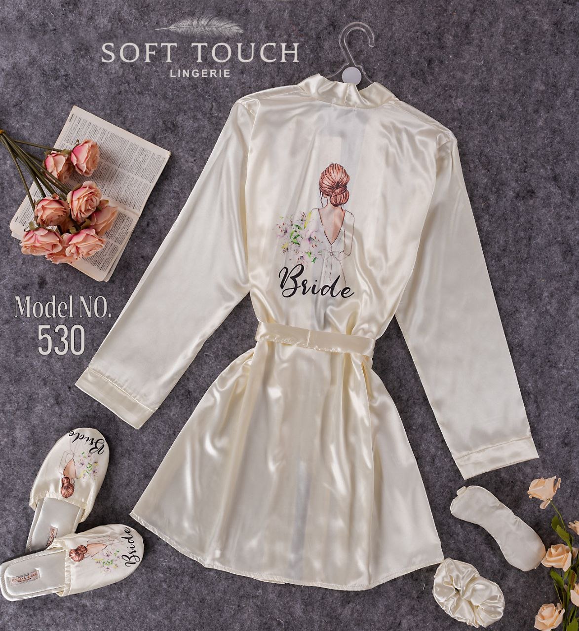 روب العروسه ستان ناعم قصير مطبوع من الخلف بتصميم انيق مع سليبر ابيض فاخر مع ربطة شعر و قناع للعين مصنع سوفت تاتش 530 يلبس الى 75 كيلو