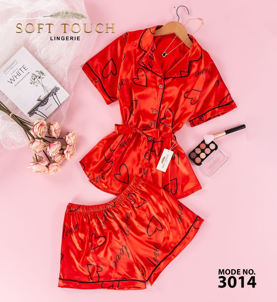 شورت ستان مع قميص زراير بالحزام مطبوع مصنع سوفت تاتش 3014 يلبس الى 75 كيلو