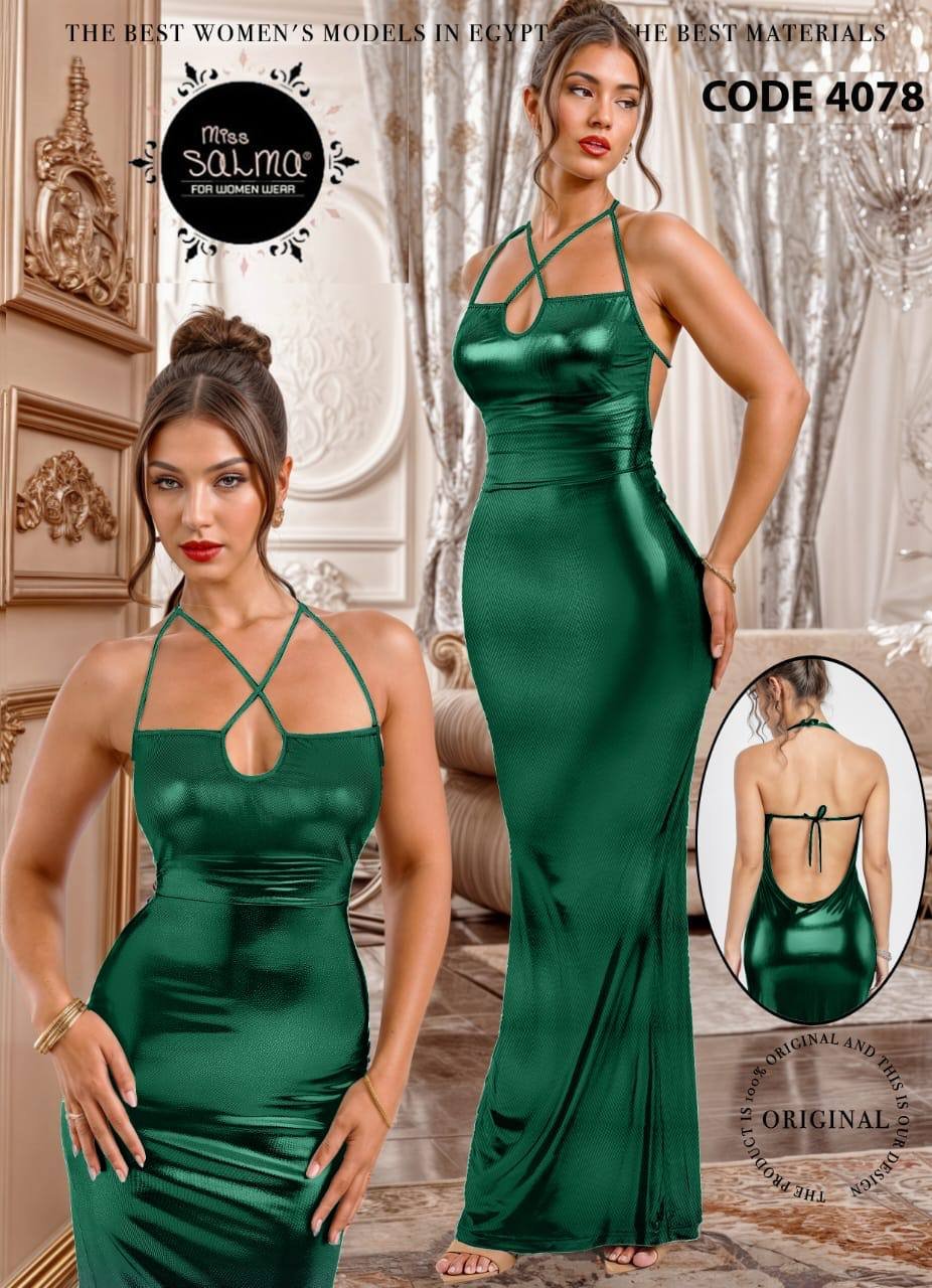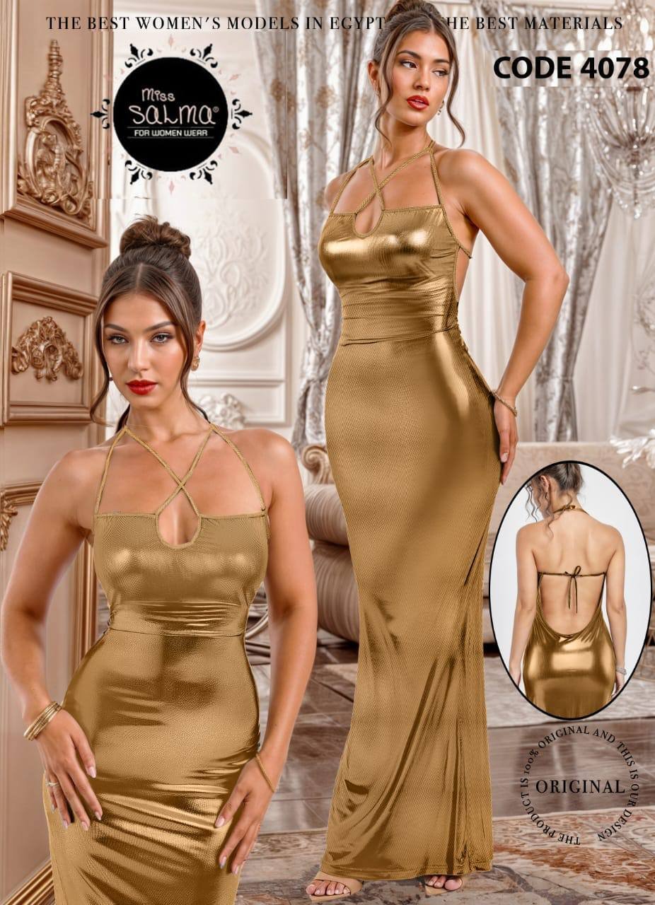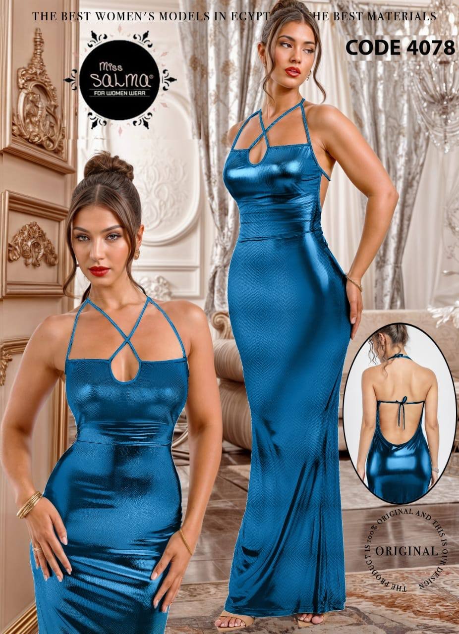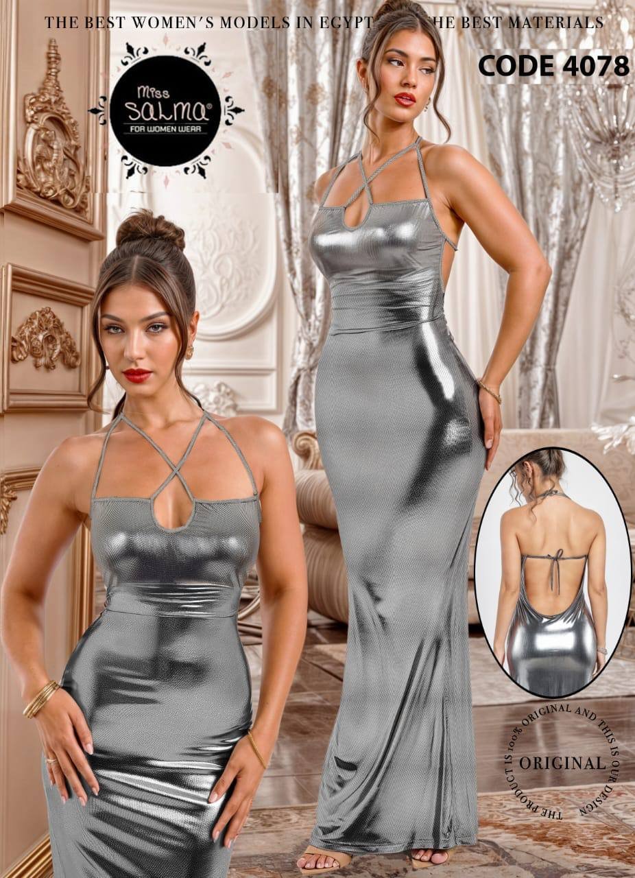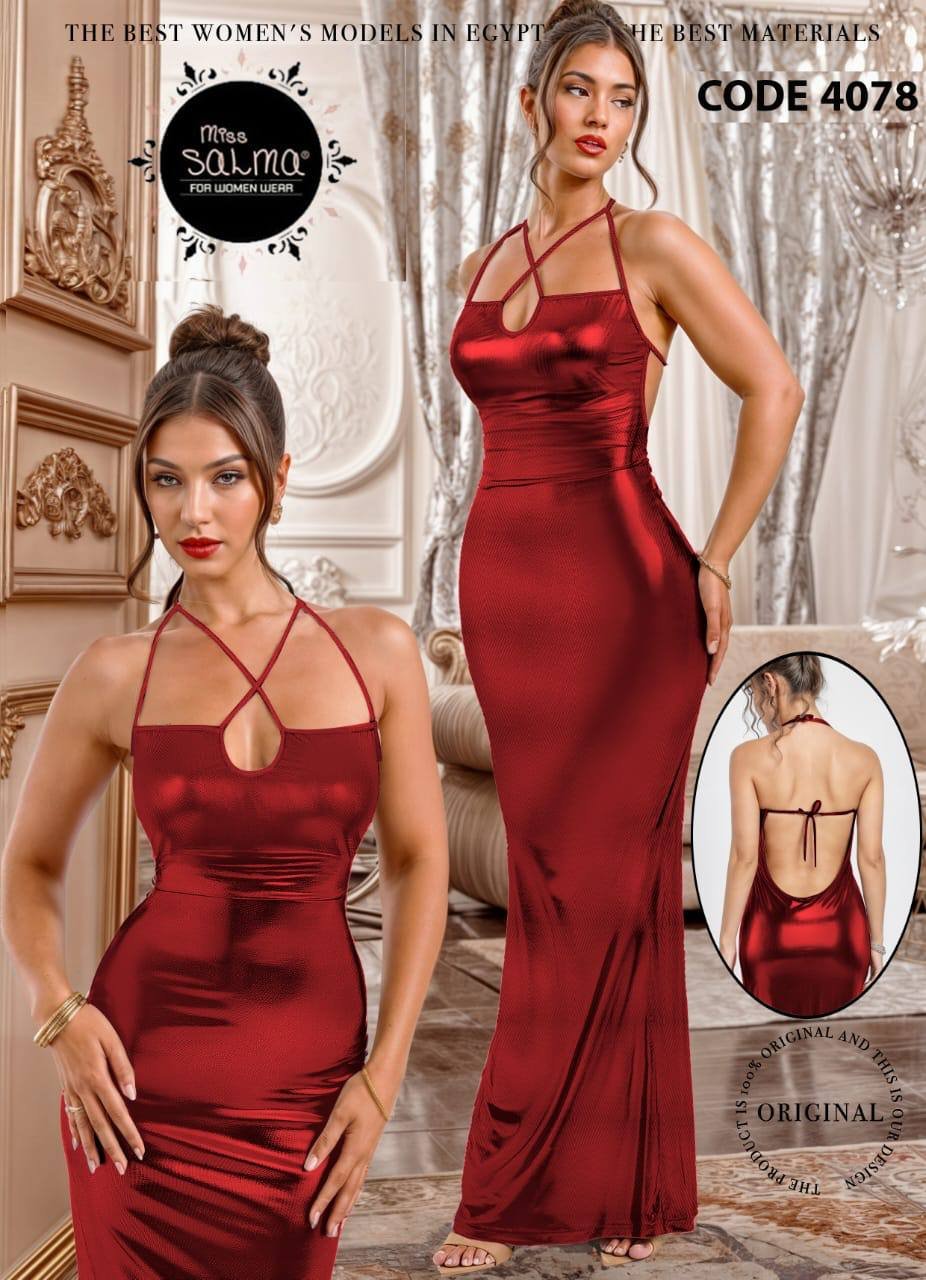 فستان سهرة طويل بتصميم لامع وانسيابي يبرز القوام برقي